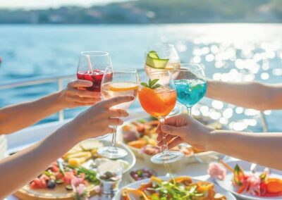 Durante la travesía, echaremos el ancla en una zona resguardada para que puedas disfrutar de un baño refrescante en aguas cristalinas. Mientras te relajas, serviremos un menú regional premium que incluye delicias como brochetas de pollo piri-piri, gazpacho algarvío, mini pasteles de bacalao y wraps mediterráneos, todo acompañado de barra libre de cerveza, vino blanco, sangría y refrescos con TiToTravel.