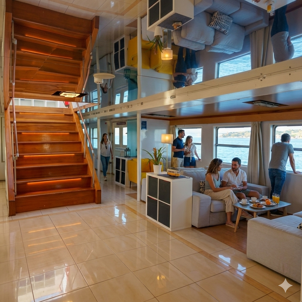 👥 El acceso a la terraza está limitado a las primeras 52 personas, según los asientos disponibles y las normas de seguridad del barco. Las normas las impone una entidad certificada.
