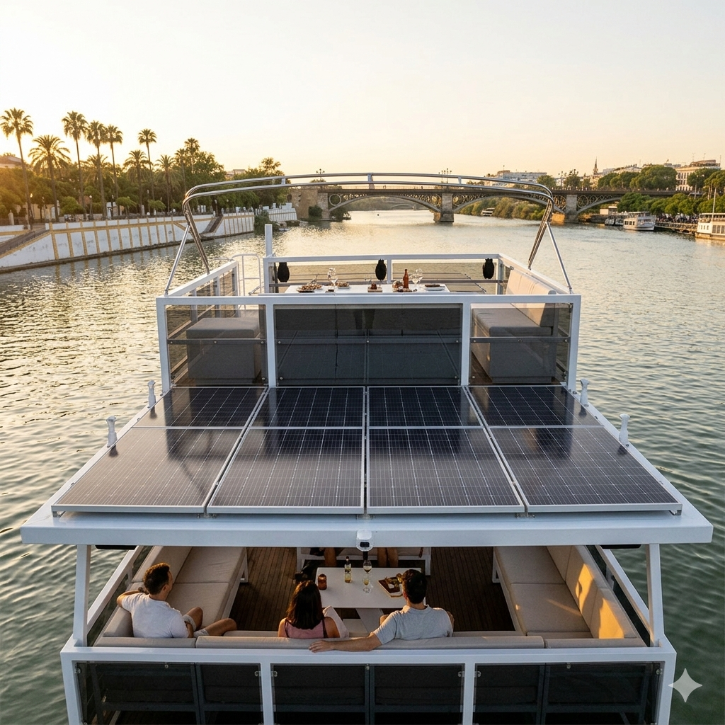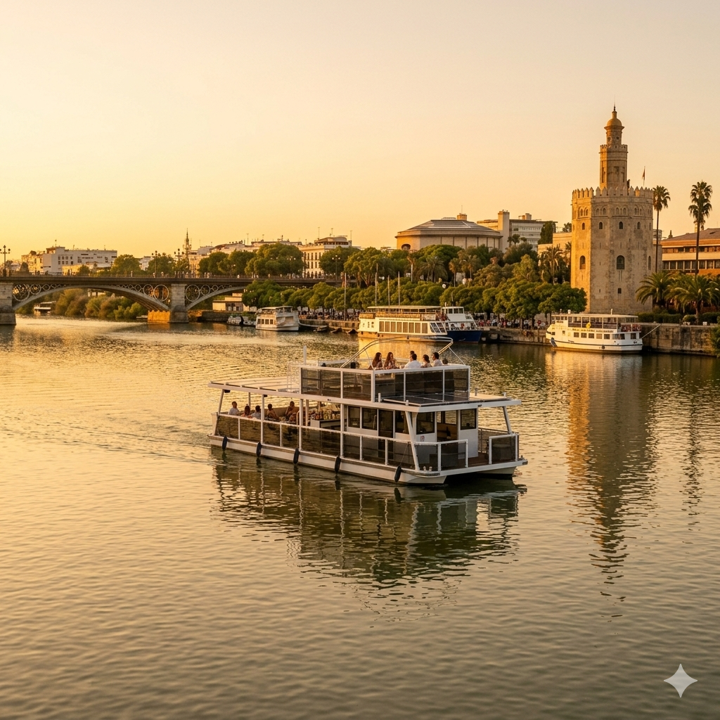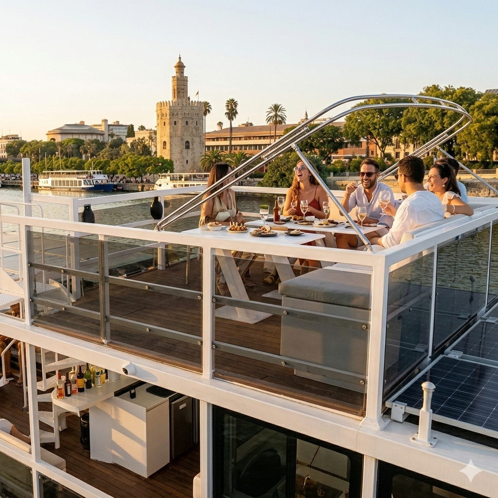Vive una experiencia inolvidable con nuestro Crucero privado en barco en Sevilla hasta 30 personas. Disfruta de un paseo exclusivo a bordo de una embarcación solar de alta gama, perfecta para grupos de amigos, familias o celebraciones especiales que buscan un entorno más íntimo. Durante 1 hora de navegación (o más, según vuestra preferencia), recorreréis el Guadalquivir con vistas privilegiadas de la Torre del Oro y el barrio de Triana.